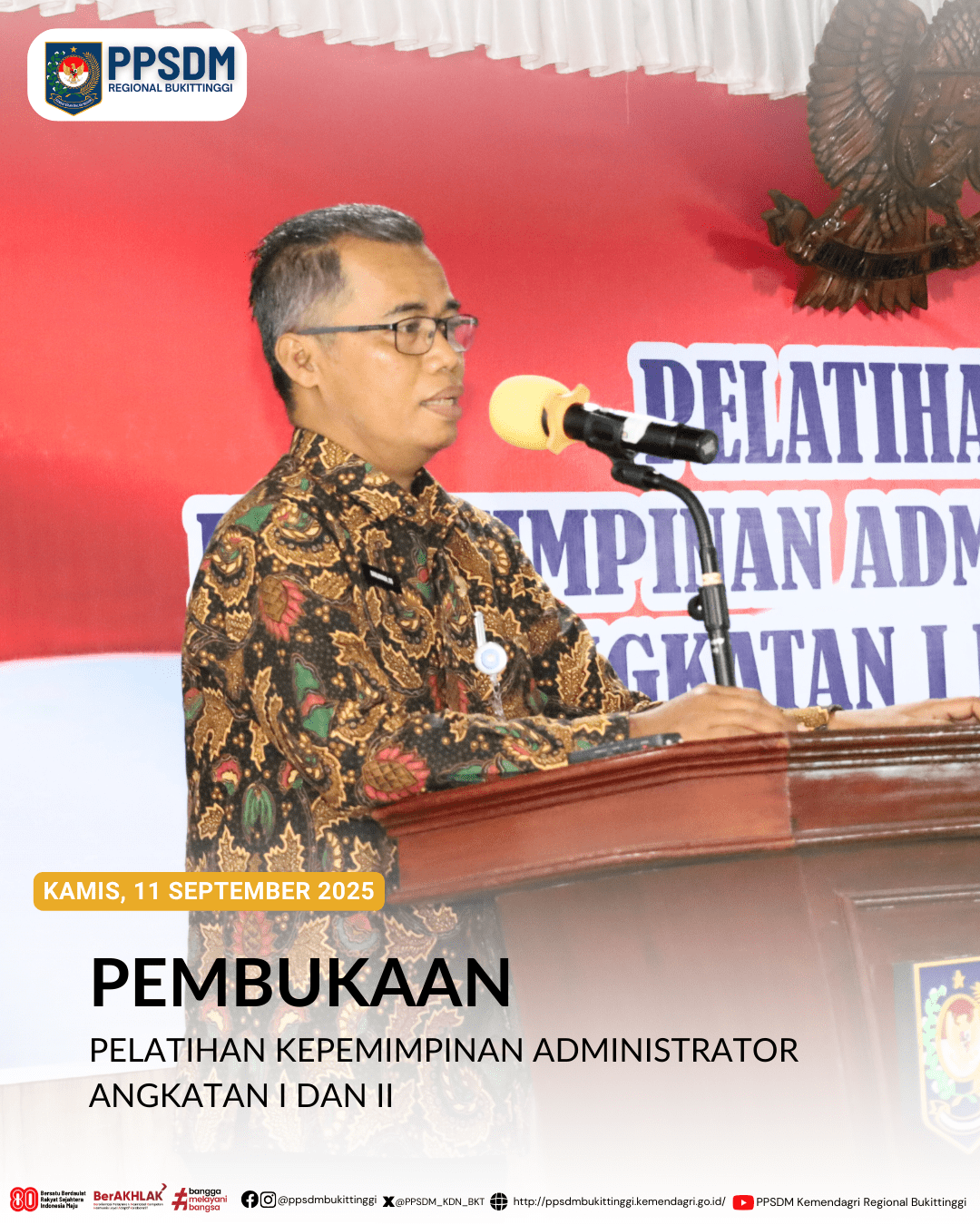 (press release). Pengelolaan keuangan daerah yang transparan dan akuntabel merupakan syarat terwujudnya pemerintahan yang bersih (clean goverance). BPSDM Kemendagri menyampaikan hal tersebut melalui Shohibul Azmi Rivai yang mewakili Kepala PPSDM Regional Bukittinggi dalam pembukaan Pelatihan Teknis dan Sertifikasi Kompetensi Pengelolaan Keuangan Daerah Bagi Pejabat Penatausahaan Keuangan pada 15 September 2025 di Kampus PPSDM Regional Bukittinggi.