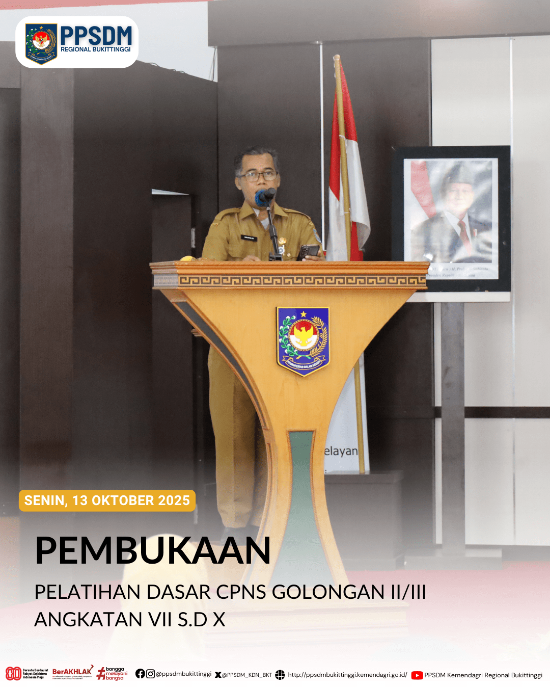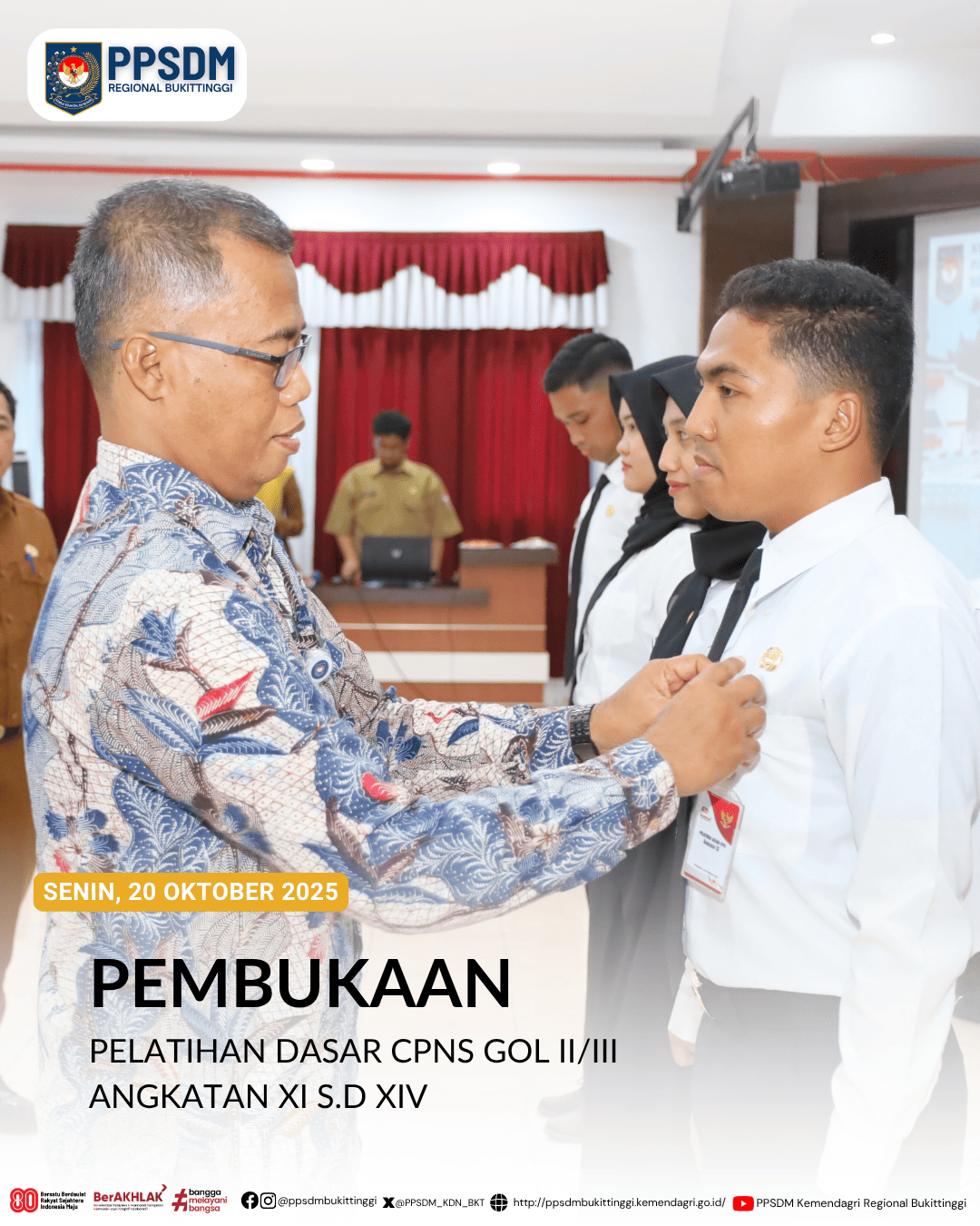(press release). Implementasi Nilai Dasar Aparatur Sipil (ASN) dibutuhkan dalam pelaksanaan pelayanan kepada masyarakat. Nilai dasar tersebut harus menjadi karakter dan membutuhkan upaya berkelanjutan untuk menjaga tetap melekat pada diri setiap ASN. Sarjayadi selaku Kepala PPSDM Regional Bukittinggi menyampaikan hal tersebut dalam pembukaan Pelatihan Dasar CPNS mewakili BPSDM Kemendagri pada 13 Oktober 2025 bertempat di Kampus PPSDM Regional Bukittinggi.
