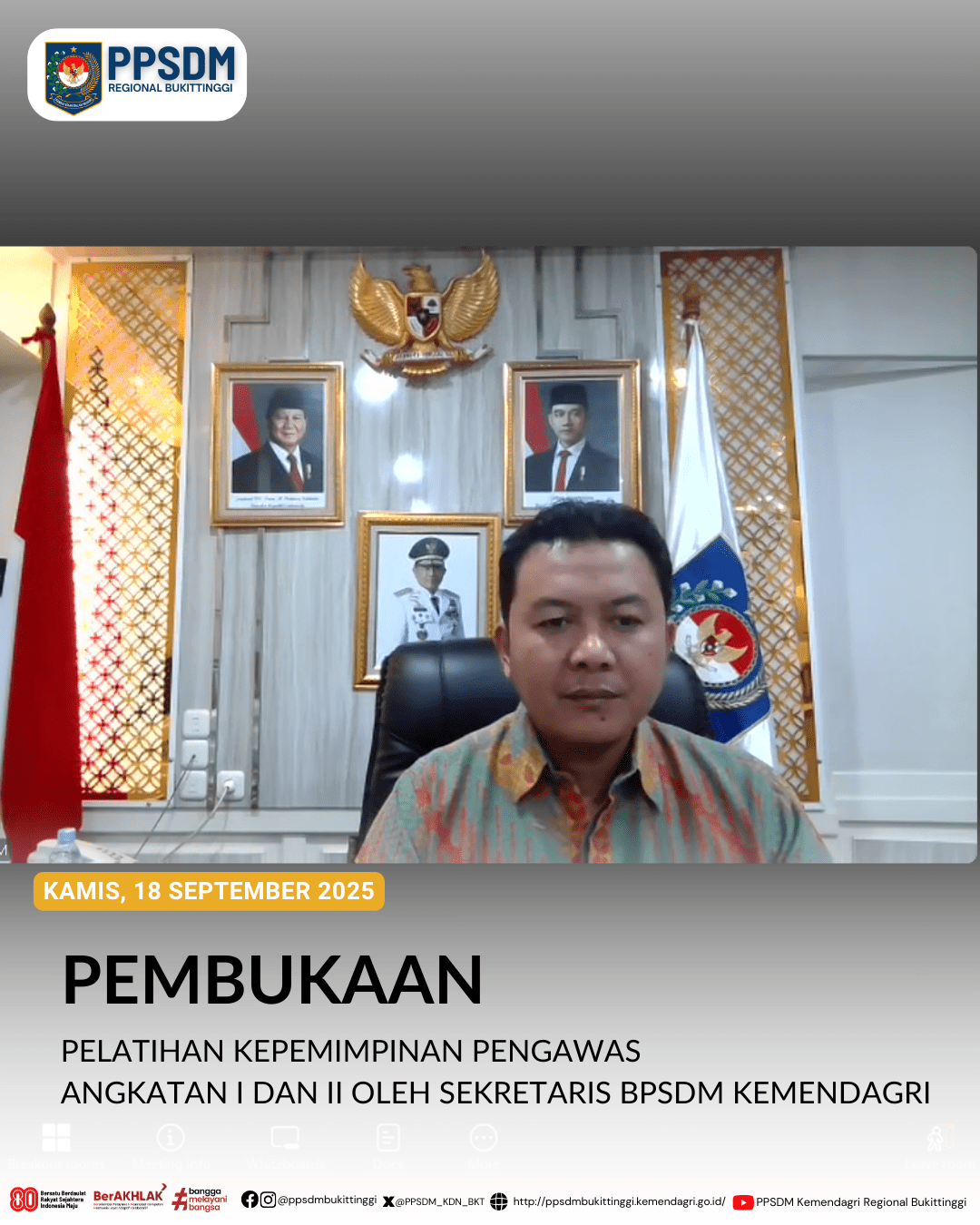 (press release). Pemimpin pelayanan harus mampu menyinergikan visi pribadi, instansi dan negara. Kolaborasi antar pribadi dan antar instansi dibutuhkan agar sinergi mendukung pencapaian Indonesia Emas 2045. Afrijal Dahrin, Sekretaris BPSDM Kementerian Dalam Negeri (Kemendagri), menyampaikan dalam pembukaan Pelatihan Kepemimpinan Pengawas (PKP) Angkatan 1 dan 2 pada 18 September 2025 di Kampus PPSDM Regional Bukittinggi.