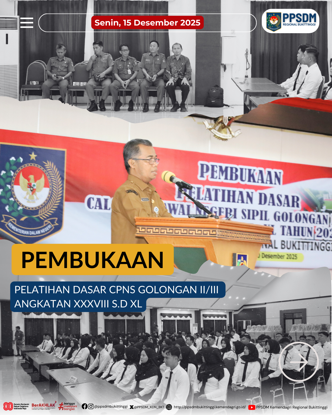 (press release). Bencana yang melanda Aceh, Sumatera Utara dan Sumatera Barat tidak menyurutkan semangat peserta untuk hadir dalam pembelajaran tatap muka. Hal ini menunjukkan tekad awal yang kuat dari peserta untuk melayani masyarakat dan contoh baik bagi aparatur lainnya. BPSDM Kemendagri melalui Sarjayadi selaku Kepala PPSDM Regional Bukittinggi menyampaikan hal tersebut dalam pembukaan Pelatihan Dasar CPNS Gelombang terakhir pada 15 Desember 2025 bertempat di Kampus PPSDM Regional Bukittinggi.