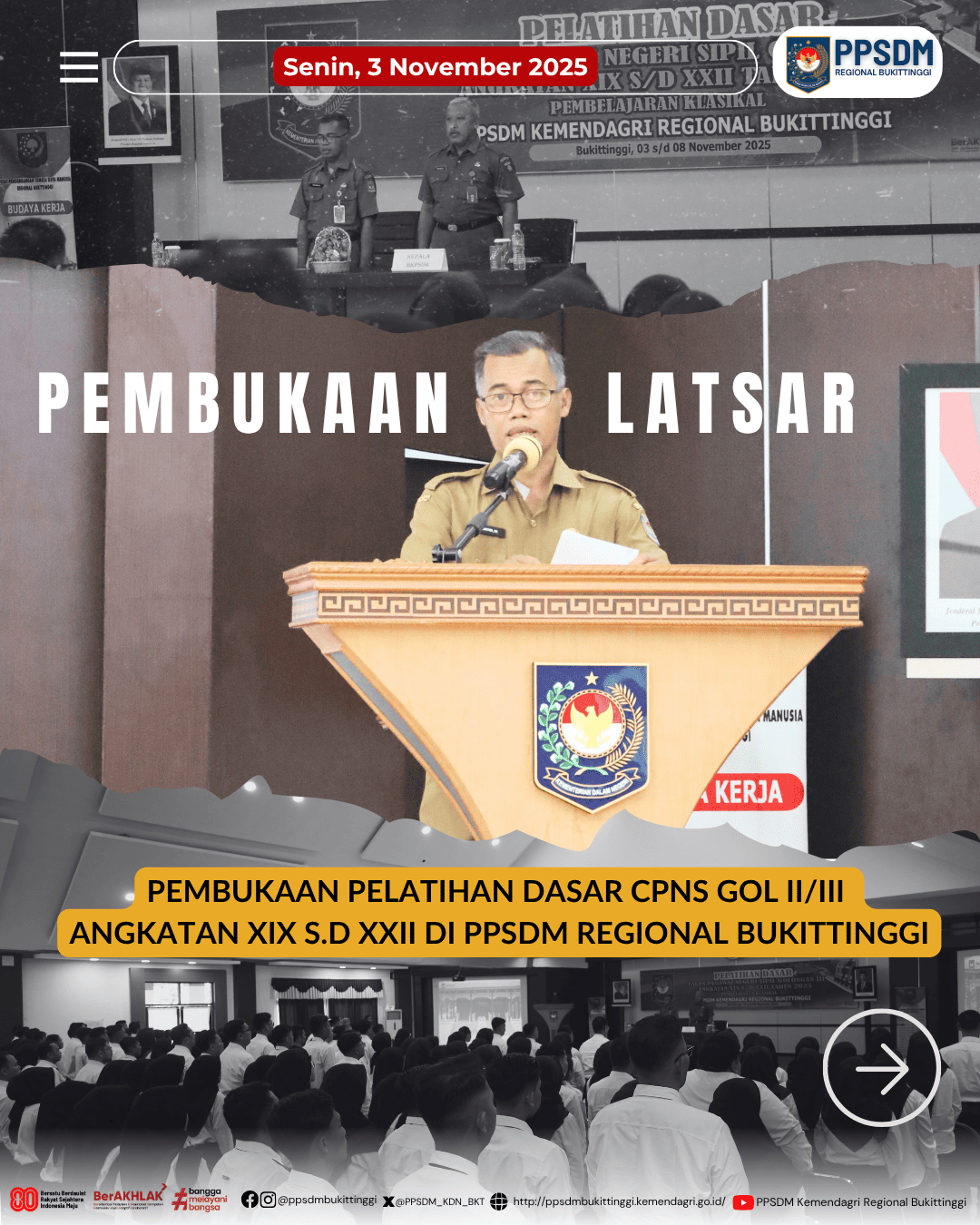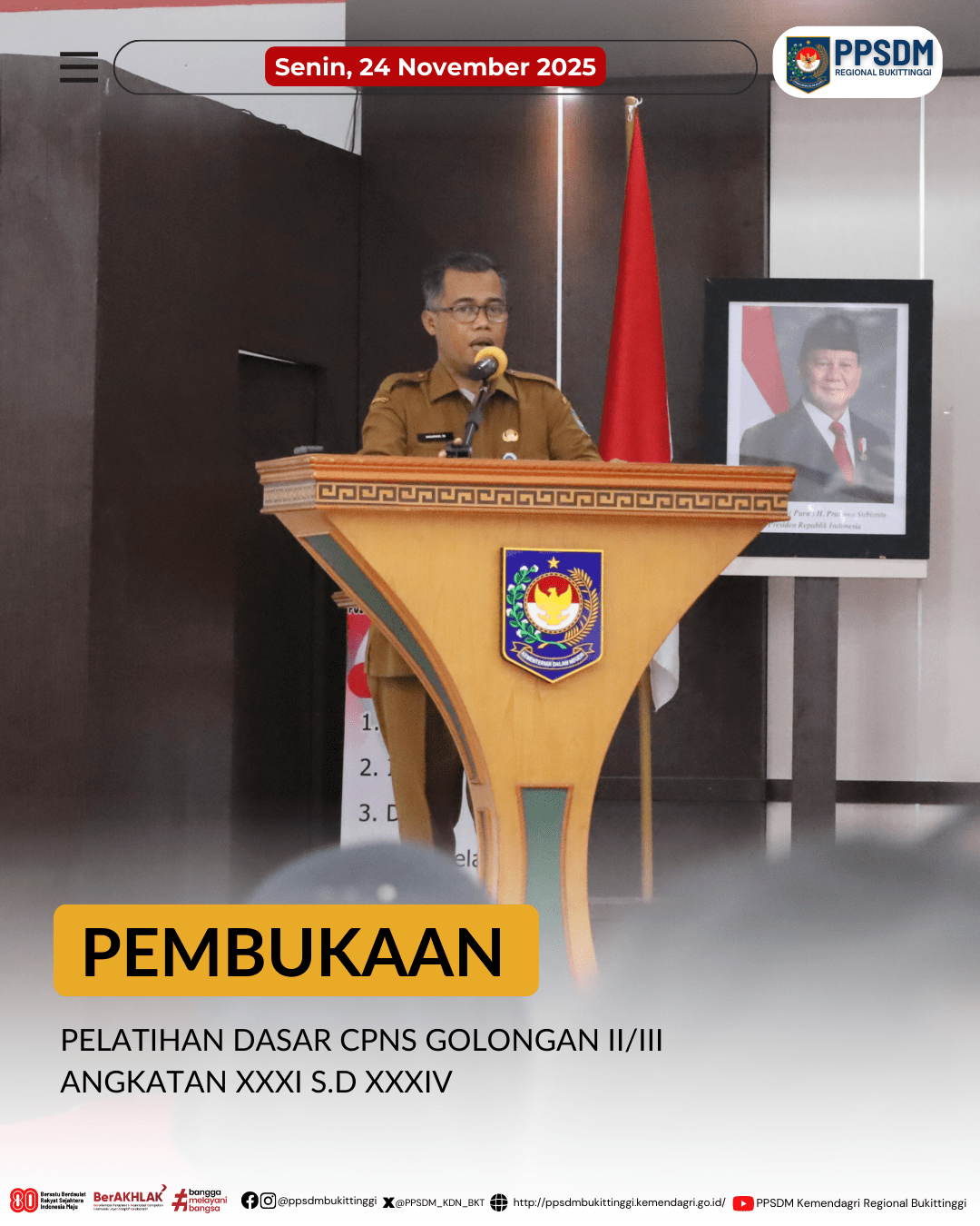 (press release).Terdapat laporan kinerja kurang baik aparatur dari masyarakat yang ditunjukkan dengan sikap tidak ramah, tidak menunjukkan empati bahkan terkesan acuh terhadap masyarakat. Kondisi tersebut diakibatkan perilaku aparatur yang masih belum menyesuaikan kode etik aparatur. BPSDM Kemendagri melalui Sarjayadi selaku Kepala PPSDM Regional Bukittinggi menyampaikan hal tersebut dalam pembukaan Pelatihan Dasar CPNS pada 24 November 2025 bertempat di Kampus PPSDM Regional Bukittinggi.