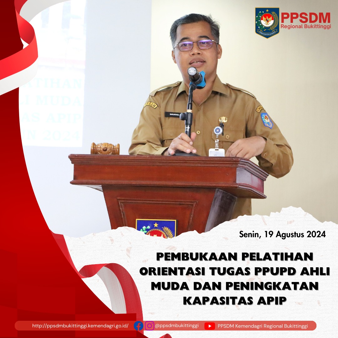 (press release). BPSDM Kementerian Dalam Negeri (Kemendagri) melalui PPSDM Regional Bukittinggi menggelar Pelatihan Orientasi Tugas Pengawas Penyelenggaraan Urusan Pemerintahan Daerah (PPUPD) Ahli Muda dan Peningkatan Kapasitas Aparat Pengawasan Intern Pemerintah (APIP). Kegiatan dibuka oleh Kepala PPSDM pada 19 Agustus 2024 di Ruang Proklamasi PPSDM Regional Bukittinggi.
