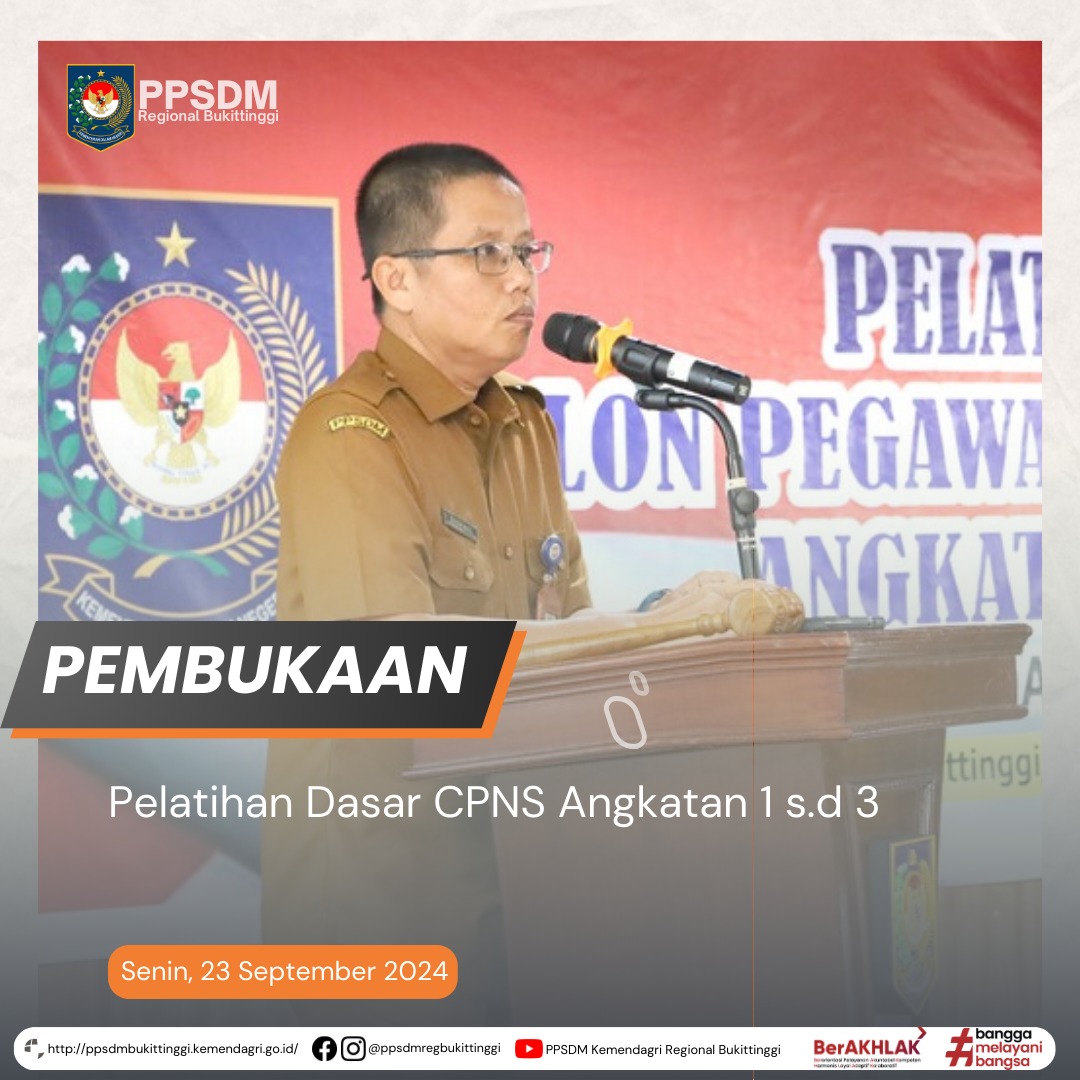 (press release). BPSDM Kementerian Dalam Negeri (Kemendagri) melalui PPSDM Regional Bukittinggi menggelar Pelatihan Dasar Calon Pegawai Negeri Sipil (Latsar CPNS) Angkatan I sampai III. Kegiatan dibuka oleh Kepala Bagian Tata Usaha mewakili Kepala PPSDM pada 23 September 2024 dan akan ditutup pada 28 September 2024 di Kampus PPSDM Regional Bukittinggi.