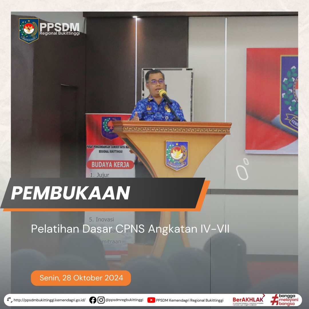 (press release). BPSDM Kementerian Dalam Negeri (Kemendagri) melalui PPSDM Regional Bukittinggi menggelar Pelatihan Dasar Calon Pegawai Negeri Sipil (Latsar CPNS) Angkatan IV sampai VII. Kegiatan dibuka oleh Kepala PPSDM Regional Bukittinggi pada 28 Oktober 2024 dan akan ditutup pada 02 November 2024 di Kampus PPSDM Regional Bukittinggi.