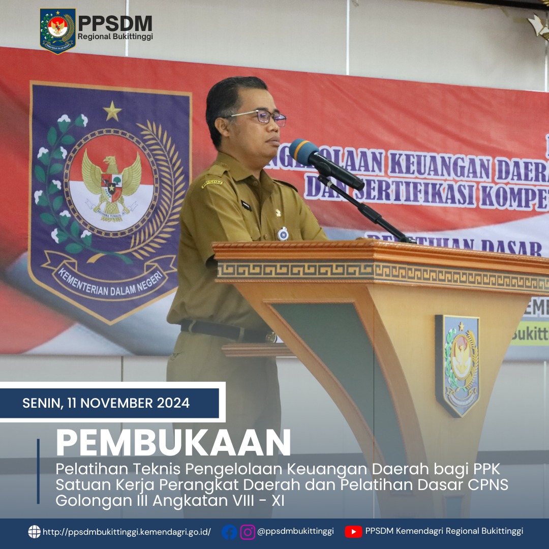 (press release). BPSDM Kementerian Dalam Negeri (Kemendagri) melalui PPSDM Regional Bukittinggi menggelar Pelatihan Dasar Calon Pegawai Negeri Sipil (Latsar CPNS) Angkatan VIII sampai dengan XI, Pelatihan Teknis Pengelolaan Keuangan Daerah Bagi PPK SKPD Dan Sertifikasi Kompetensi Pengelola Keuangan Daerah. Kegiatan dibuka oleh Kepala PPSDM Regional Bukittinggi pada 11 November 2024 dan akan berakhir pada 16 November 2024 di Kampus PPSDM Regional Bukittinggi.