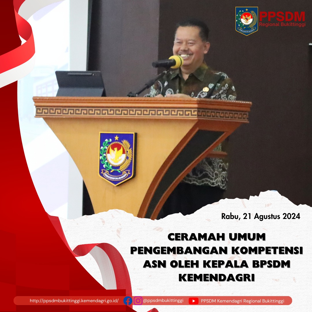 (press release). BPSDM Kementerian Dalam Negeri (Kemendagri) melalui PPSDM Regional Bukittinggi menggelar Ceramah Umum dan Penutupan Pelatihan Administrator (Angkatan) Angkatan 1 pada 21 Agustus 2024 di Kampus PPSDM Regional Bukittinggi.