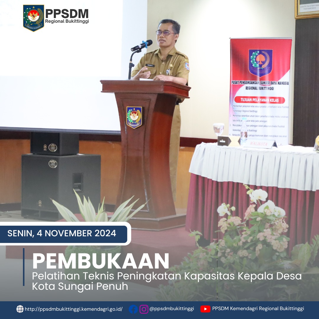 (press release). BPSDM Kementerian Dalam Negeri (Kemendagri) melalui PPSDM Regional Bukittinggi menggelar Pelatihan Teknis Peningkatan Kapasitas Kepala Desa. Kegiatan dibuka oleh Kepala PPSDM pada 4 November 2024 di Kampus PPSDM Regional Bukittinggi dan turut dihadiri Penjabat Sementara (Pjs) Walikota Sungai Penuh, Tema Wisman berserta jajaran.