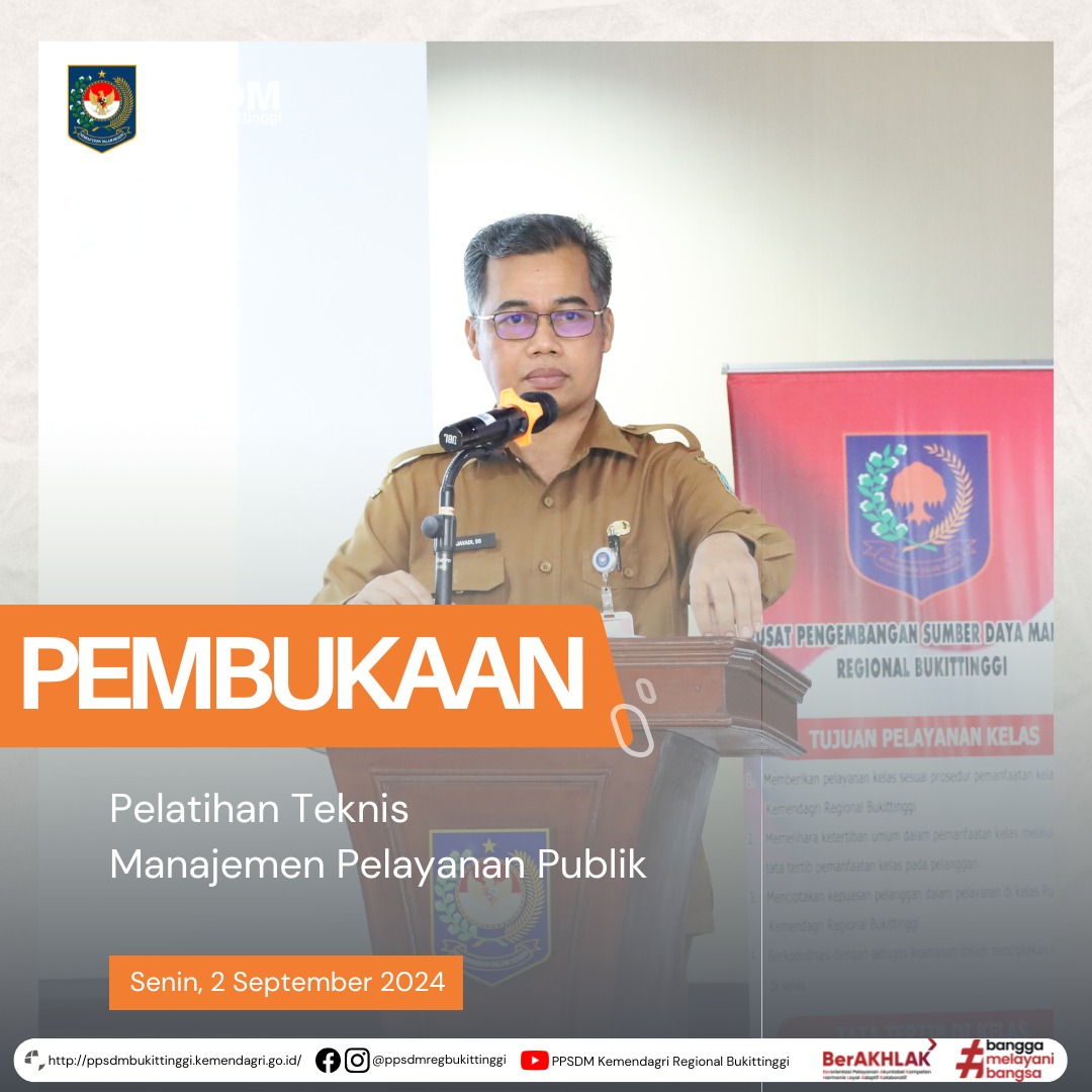 (press release). BPSDM Kementerian Dalam Negeri (Kemendagri) melalui PPSDM Regional Bukittinggi menggelar Pelatihan Teknis Manajemen Pelayanan Publik bagi organisasi perangkat daerah. Kegiatan dibuka oleh Kepala PPSDM pada 2 September 2024 di Kampus PPSDM Regional Bukittinggi.