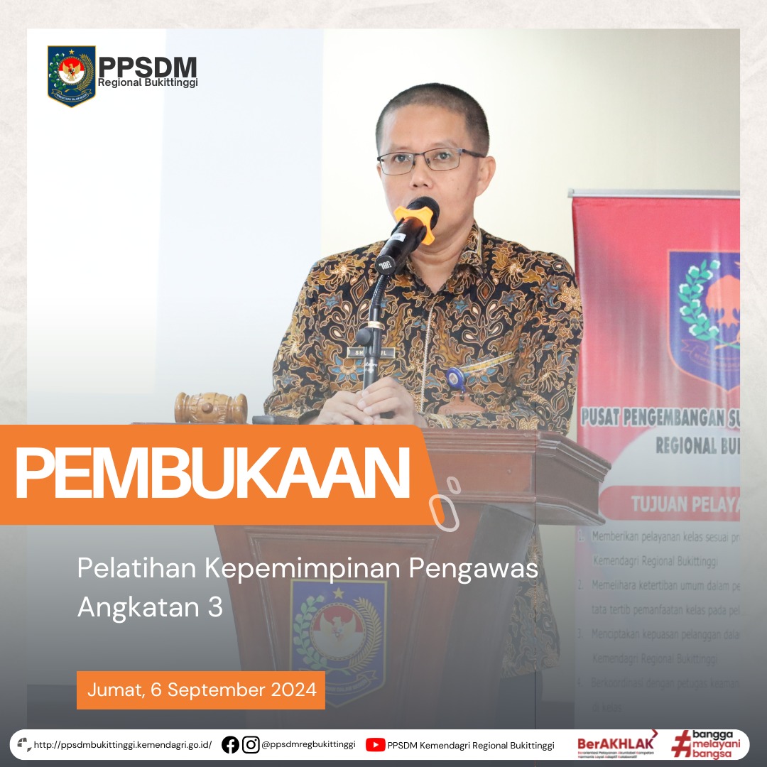 (siaran pers). BPSDM Kementerian Dalam Negeri (Kemendagri) melalui PPSDM Daerah Bukittinggi menggelar Pelatihan Kepemimpinan Pengawas (PKP) Angkatan 3. Kegiatan dibuka oleh Kepala PPSDM pada 5 September 2024 dan akan ditutup pada 27 November 2024 di Kampus PPSDM Regional Bukittinggi.