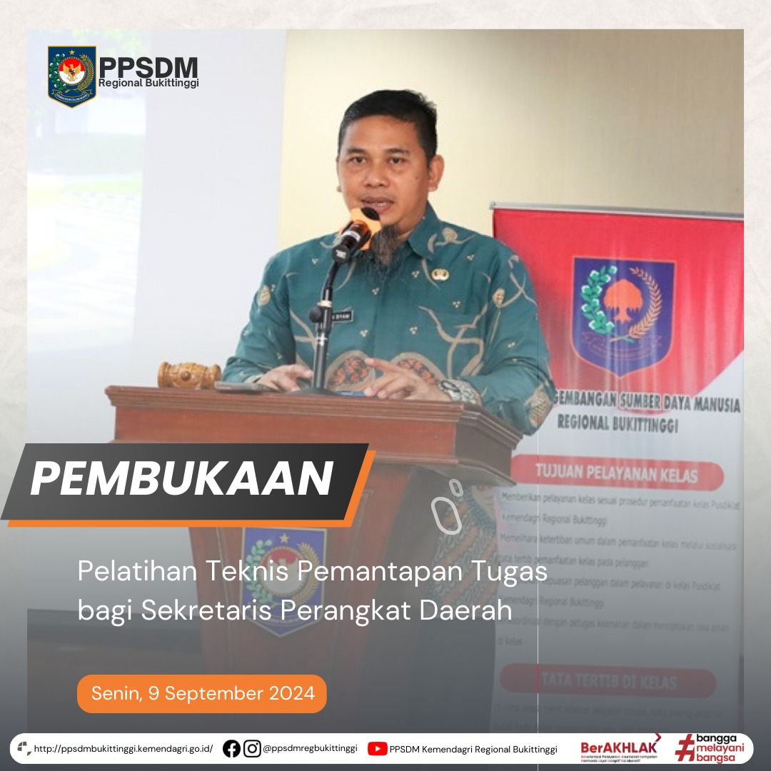 (press release). BPSDM Kementerian Dalam Negeri (Kemendagri) melalui PPSDM Regional Bukittinggi menggelar Pelatihan Teknis Pemantapan Tugas Sekretaris Organisasi Perangkat Daerah (OPD). Kegiatan dibuka oleh Koordinator Widyaiswara mewakili Kepala PPSDM pada 9 September hingga 13 September 2024 di Kampus PPSDM Regional Bukittinggi.