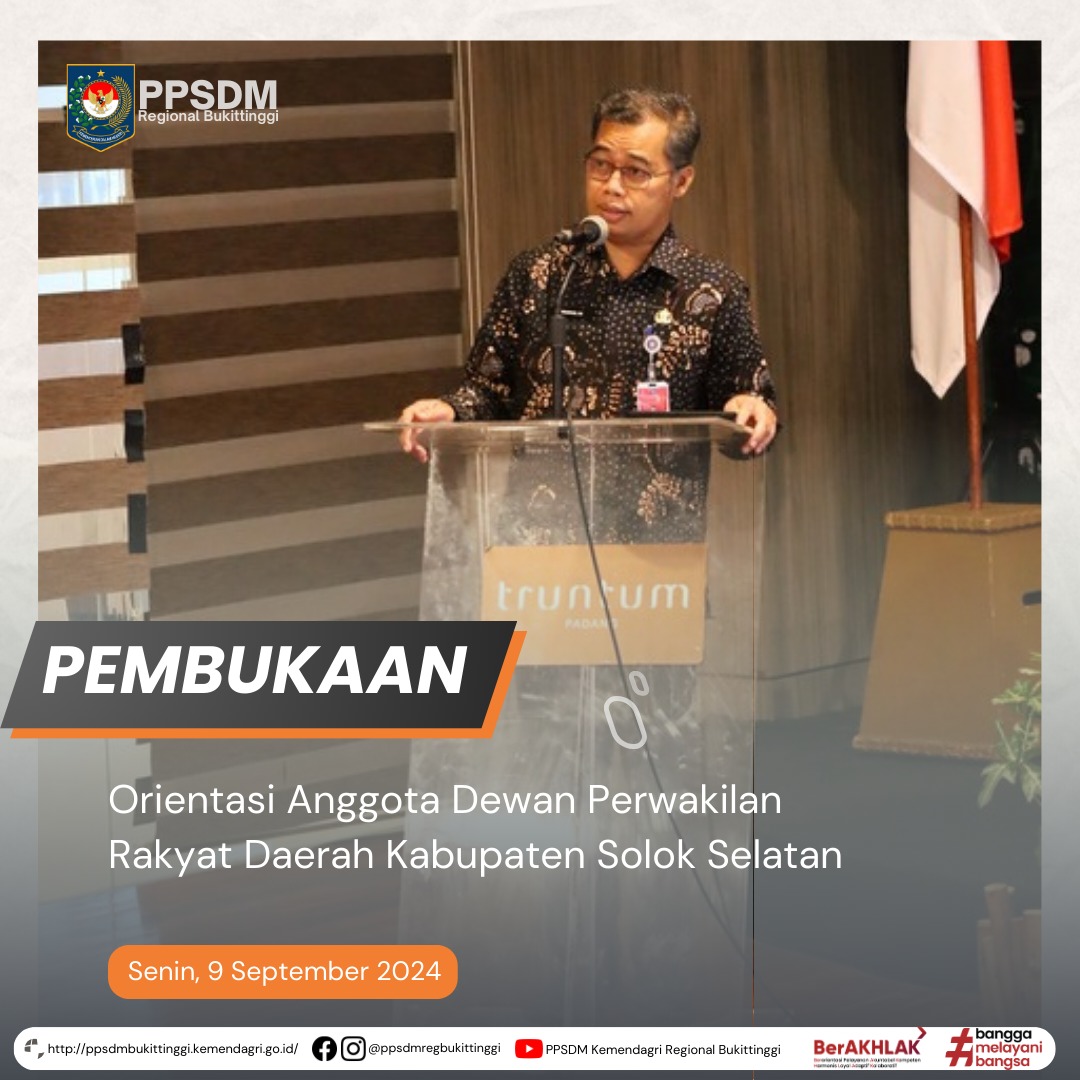 (press release). BPSDM Kementerian Dalam Negeri (Kemendagri) melalui PPSDM Regional Bukittinggi menggelar Orientasi Dewan Perwakilan Rakyat Daerah (DPRD) Kabupaten Solok Selatan. Kegiatan dibuka oleh Kepala PPSDM pada 09 September 2024 dan akan ditutup pada 12 September 2024 di Hotel Truntum Padang.