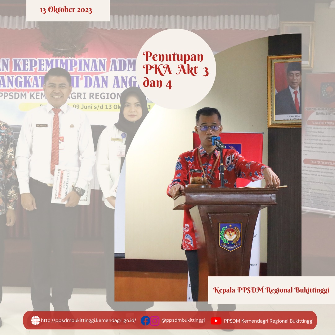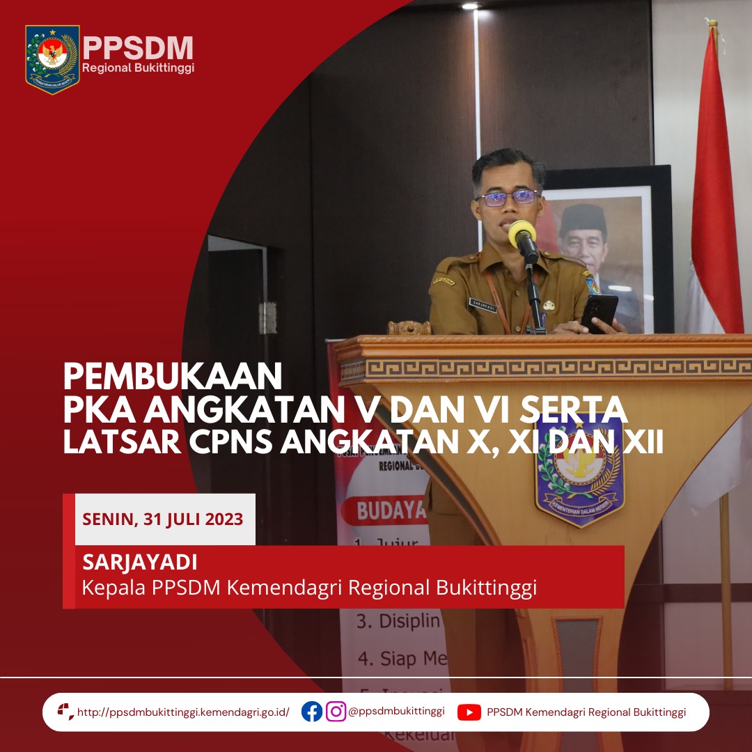 (press release). Badan Pengembangan Sumber Daya Manusia (BPSDM) Kementerian Dalam Negeri (Kemendagri) menyelenggarakan Pelatihan Kepemimpinan Administrator (PKA) Angkatan 5 dan 6 serta Pelatihan Dasar CPNS (Latsar) Angkatan 10, 11 dan 12 yang dibuka pada 31 Juli 2023. PKA bertujuan membentuk pemimpin kinerja yang mengelola pelayanan agar lebih baik bagi masyarakat. Sedangkan Latsar bertujuan membekali CPNS memiliki nilai dasar Berorientasi Pelayanan, Akuntabel, Kompeten, Harmonis, Loyal, Adaptif dan Kolaboratif (BerAKHLAK).