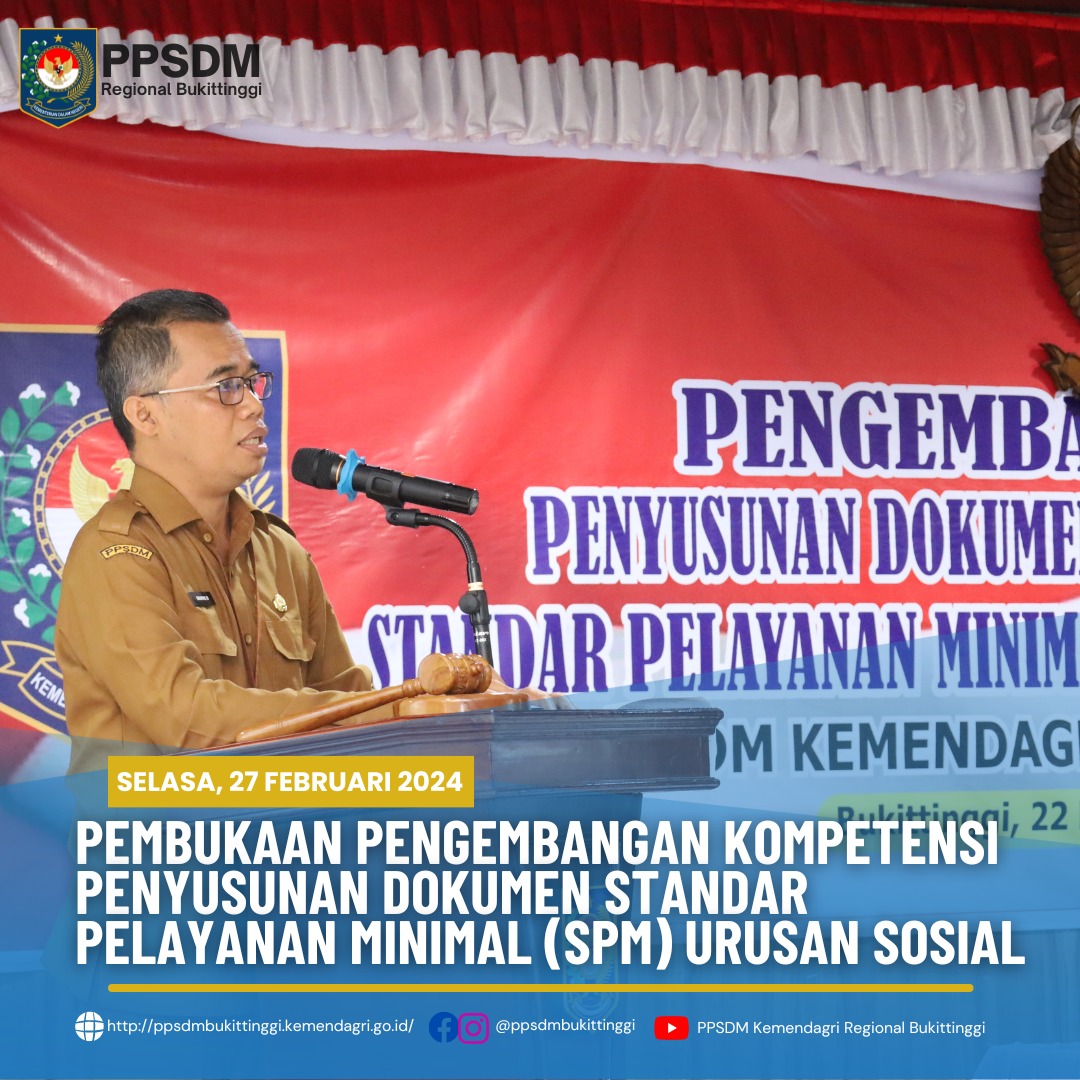 (press release). BPSDM Kementerian Dalam Negeri (Kemendagri) melalui PPSDM Regional Bukittinggi menggelar pelatihan teknis Penyusunan Dokumen Perencanaan dalam Hal Penerapan Standar Pelayanan Minimal (SPM) Bidang Sosial Angkatan 1 dan 2. Kegiatan dibuka oleh Kepala PPSDM pada 27 Februari dan akan ditutup Pada 29 Februari 2024 di Baso.