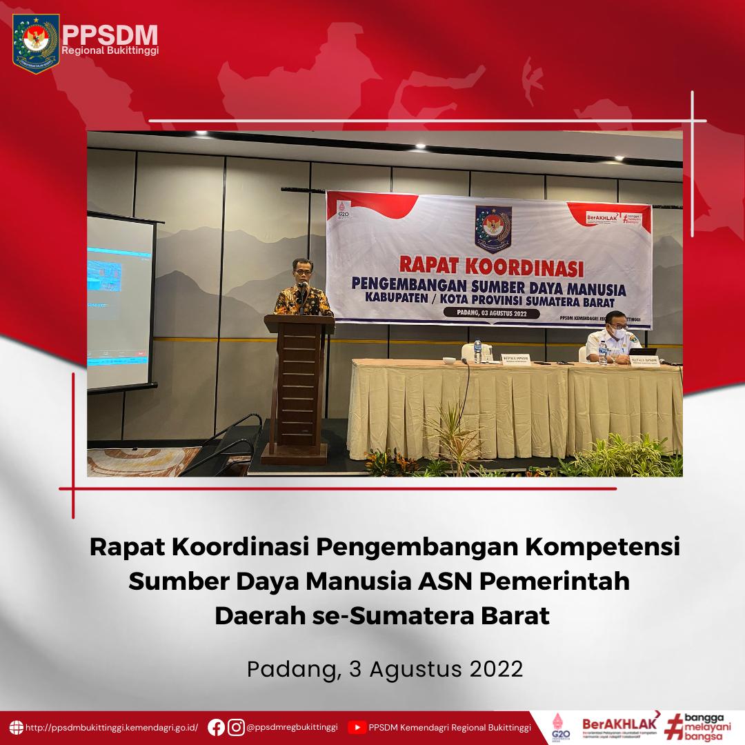 Padang, Rabu (3/08/2022), Pusat Pengembangan Sumber Daya Manusia Kemendagri Regional Bukittinggi menggelar Rapat Koordinasi Pengembangan Kompetensi Sumber Daya Manusia ASN Pemerintah Daerah se-Sumatera Barat yang dibuka langsung oleh Kepala PPSDM Regional Bukittinggi, Sarjayadi. Tujuan dilaksanakannya Rapat Koordinasi ini adalah untuk memperkuat kolaborasi dan relasi antara PPSDM Regional Bukittinggi dengan BPSDM/BKPSDM Pemerintah Daerah se-Sumatera Barat serta pelaksanaan Literasi Digital bagi ASN se- Sumatera Barat. Kegiatan rapat koordinasi diikuti oleh 36 orang peserta yang berasal BPSDM Provinsi Sumatera Barat dan BKPSDM dari 17 Kabupaten/Kota se-Sumatera Barat yang terdiri dari: BPSDM Provinsi Sumatera Barat, Kabupaten Solok Selatan, Kabupaten Tanah Datar, Kabupaten Lima Puluh Kota, Kabupaten Solok, Kabupaten Agam, Kota Payakumbuh, Kabupaten Pesisir Selatan, Kabupaten Sijunjung, Kabupaten Pasaman Barat, Kabupaten Kepulauan Mentawai, Kota Sawahlunto, Kabupaten Dhamasraya, Kota Pariaman, Kota Padang Panjang, Kota Bukittinggi, Kabupaten Pasaman, dan Kabupaten Padang Pariaman