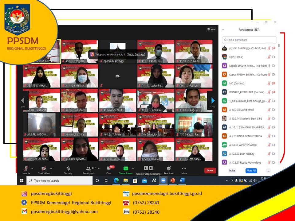 Kegiatan pembukaan di awali dengan laporan oleh Kepala Pusat Pengembangan Sumber Daya Manusia Regional Bukittinggi, Sarjayadi, yang menyampaikan bahwa Pelatihan Dasar Calon PNS Golongan II/III Angkatan I-XII dilaksanakan dengan model e-Learning dengan jumlah peserta 477 orang yang dibagi ke dalam 12 angkatan, yang berasal dari daerah Kota Padang Panjang, Kabupaten Dharmasraya, Kota Pekanbaru, Kabupaten Kepulauan Karimun, dan Kota Sibolga. Pelaksanakan Pelatihan Dasar CPNS dilaksanakan dari tanggal 26 April sampai tanggal 31 Juli 2021.