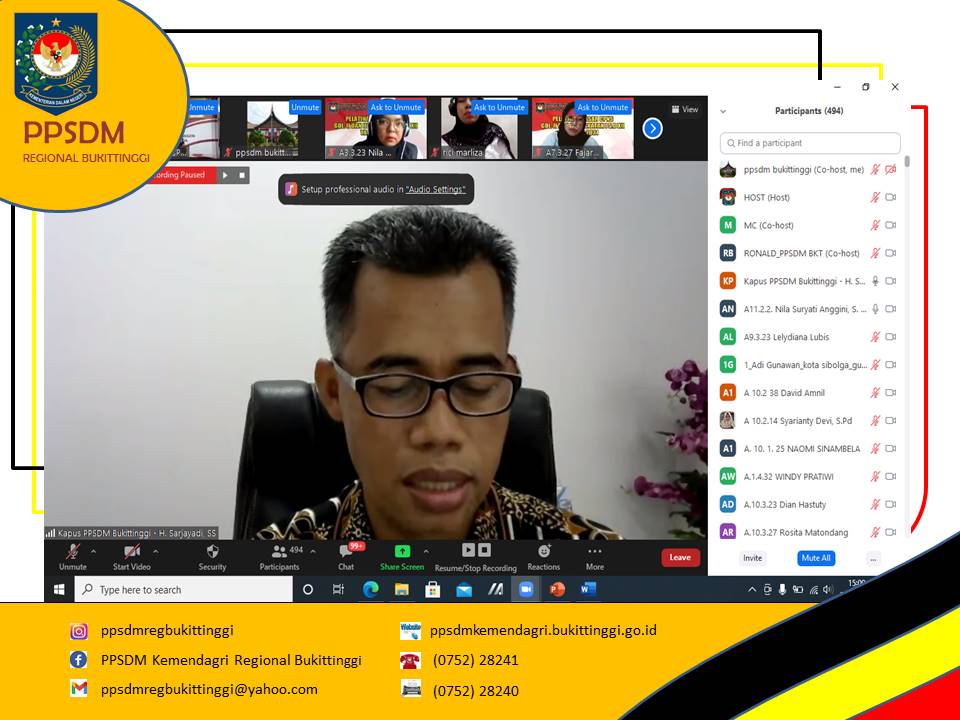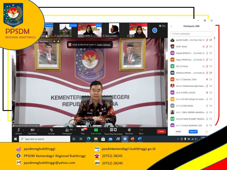 Rangkaian kegiatan selanjutnya adalah Arahan dari Kepala Badan Pengembangan Sumber Daya Manusia Kementerian Dalam Negeri Republik Indonesia, Teguh Setyabudi, dalam arahannya Kepala BPSDM menyampaikan bahwa tantangan untuk ASN era sekarang adalah seluruh ASN memiliki pola pikir “IT MINDED” yang artinya seluruh ASN harus melek IT karena perkembangan dan perubahan dalam bidang IT terjadi setiap saat. Terutama pada masa Pandemi Covid-19 saat ini semua pelayanan masyarakat dan kegiatan perkantoran lainnya dilakukan secara online. Walaupun demikian, sebagai ASN kita tetap harus menjaga integritas dalam melaksanakan tugas dan tanggung jawab.