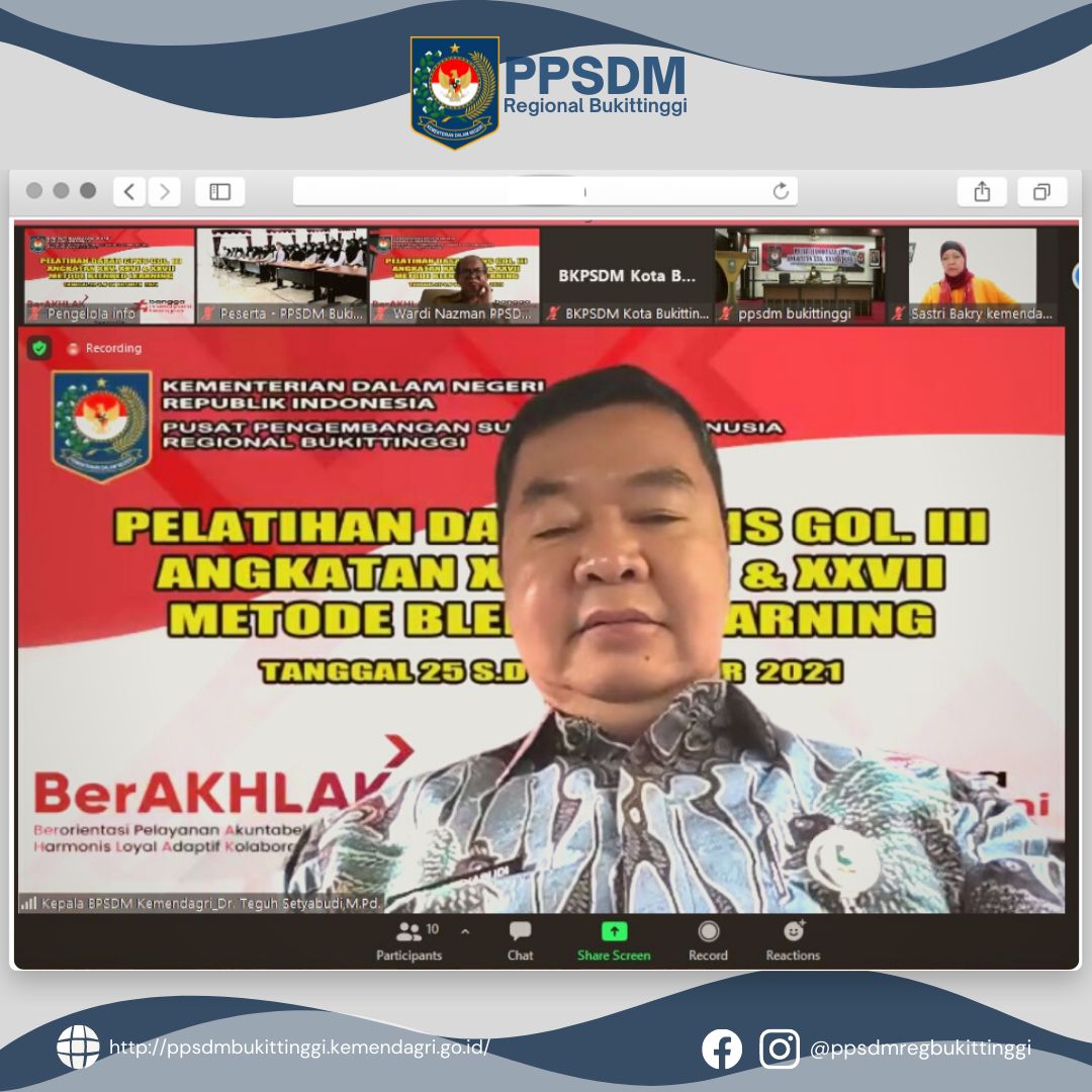 Kegiatan Pembukaan Latsar dengan metode Blended Learning tersebut dilaksanakan pada Jadwal Pembelajaran Klasikal sebagaimana diatur pada Keputusan Kepala Lembaga Administrasi Negara Nomor: 93/K.1/PDP.07/2021 Tentang Pedoman Penyelenggaraan Pelatihan Dasar Calon Pegawai Negeri Sipil. Bapak Teguh Setiabudi berkesempatan membuka acara secara virtual melalui aplikasi zoom meeting disaksikan oleh peserta yang hadir pada Aula Lantai 2 Gedung PPSDM Regional Bukittinggi.