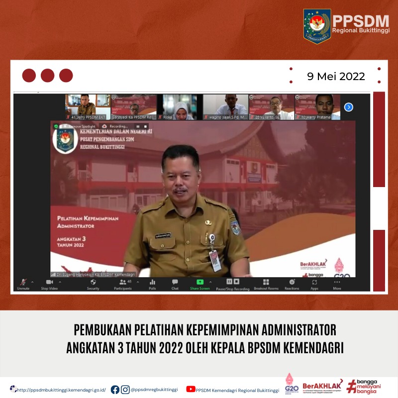 Kegiatan PKA Angkatan 3 dibuka secara daring oleh Kepala Badan Pengembangan Sumber Daya Manusia (BPSDM) Kementerian Dalam Negeri RI Dr. Sugeng Haryono yang pada kesempatan tersebut beliau juga memberikan sambutan kepada peserta pelatihan. Kegiatan PKA Angkatan 3 dilaksanakan mulai tanggal 9 Mei sampai dengan 15 September 2022 menggunakan metode Blended Learning. Sebanyak 40 orang peserta mengikuti kegiatan tersebut yang berasal dari Pemerintah Kabupaten Deli Serdang, Kota Pekanbaru, Kota Dumai, Kabupaten Siak, Kabupaten Kampar, Kabupaten Rokan Hulu dan Kabupaten Dharmasraya.