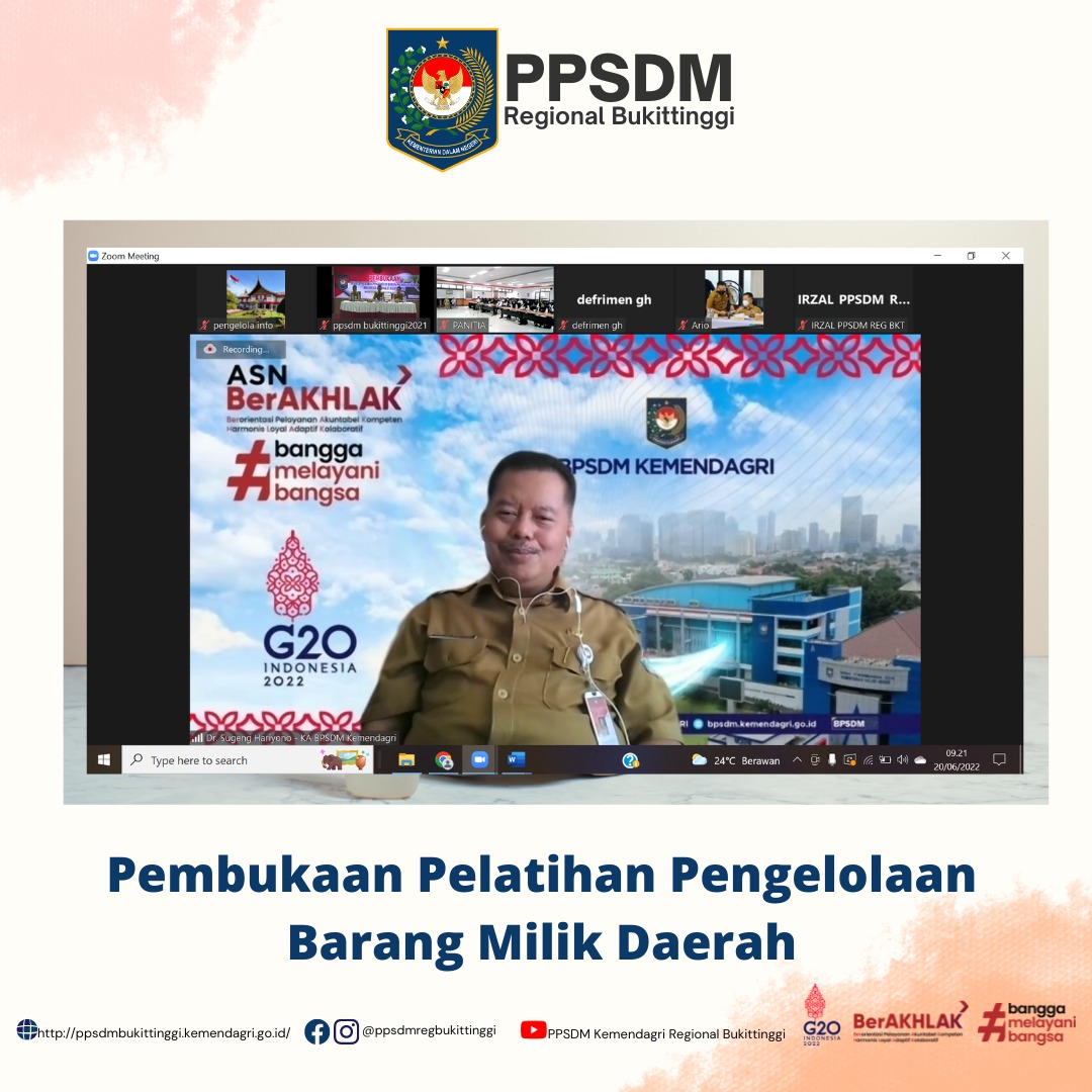 Kepala Badan Pengembangan Sumber Daya Manusia (BPSDM) Kemendagri, Sugeng Hariyono, hadir secara virtual memberikan pengarahan terkait peningkatan kemampuan untuk mengelola Barang Milik Daerah.