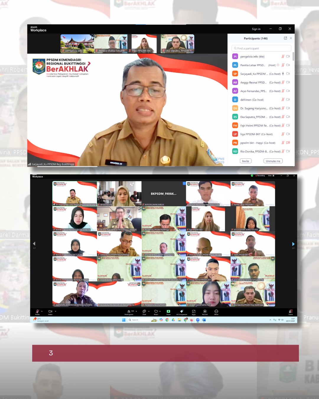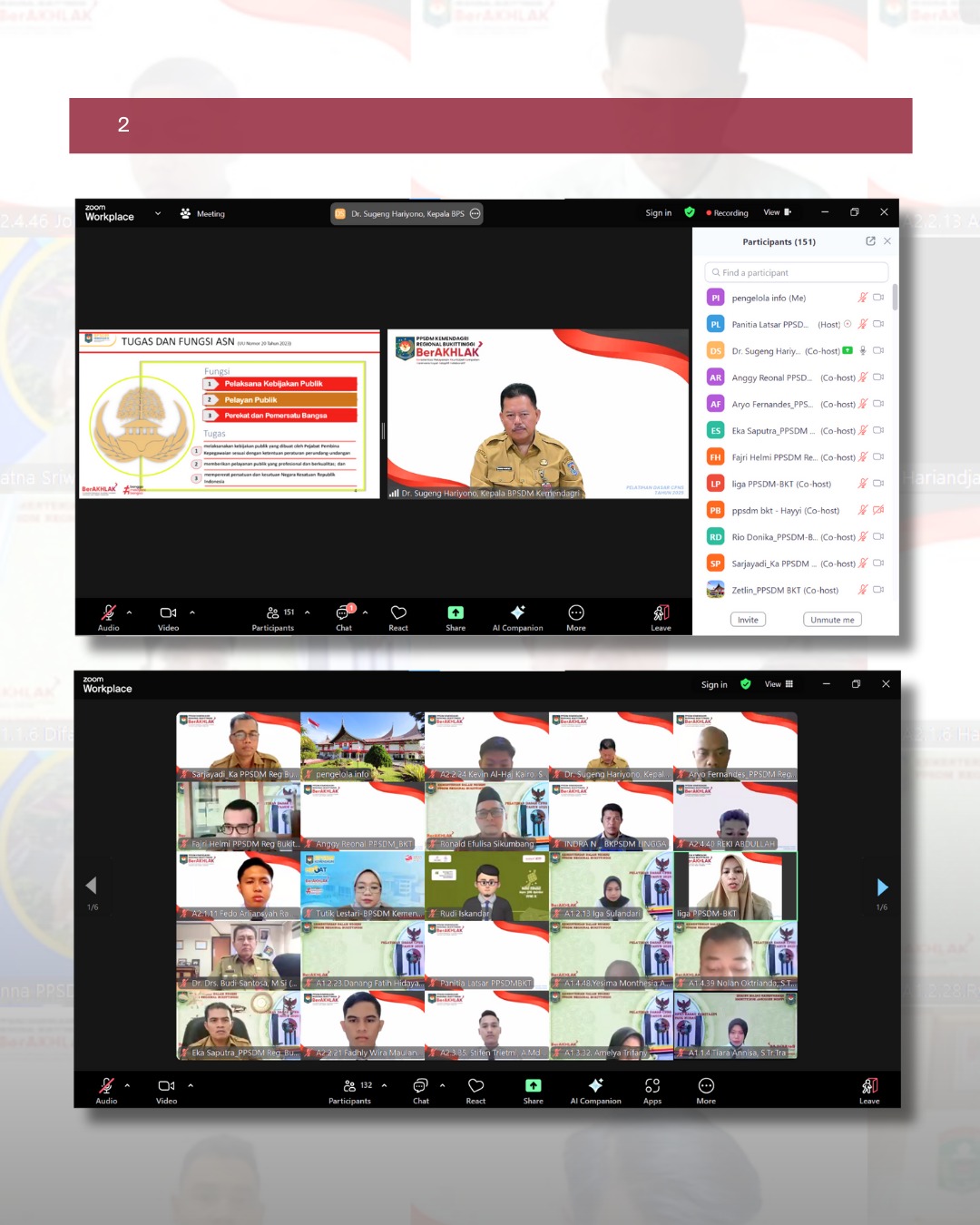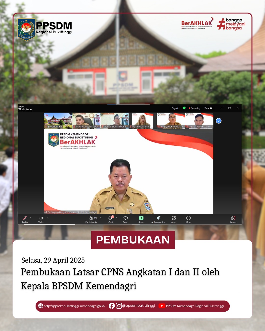 Sarjayadi sebagai Kepala PPSDM Kemendagri Regional Bukittinggi melaporkan 96 orang peserta dilatih untuk membentuk karakter PNS yang dibagi menjadi 4 agenda yaitu; agenda sikap perilaku bela negara, agenda nilai–nilai dasar PNS, agenda kedudukan dan peran PNS dalam Negara Kesatuan Republik Indonesia dan agenda habituasi. Pelatihan yang direncanakan selama 599 Jam pelajaran (JP) atau setara dengan 71 hari pelatihan. Model pembelajaran full distance learning (pembelajaran jarak jauh keseluruhan) dimulai pada tanggal 14 April 2025 dengan pembelajaran mandiri dan akan ditutup pada 24 Juli 2025.