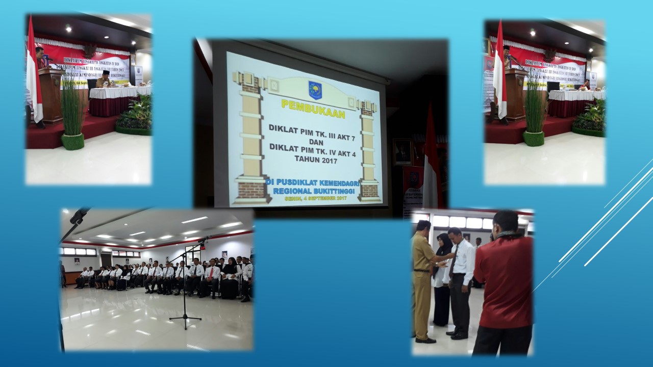 Laporan Kabid Diklat diilanjutkan oleh Sambutan dari Kepala Pusat Pendidikan dan Pelatihan Kementerian Dalam Negeri Regional Bukittinggi, Bapak DR. Ir. H. Suroyo, M.Si. Kapusdiklat membuka sambutannya dengan menyampaikan permohonan maaf atas ketidak hadiran Kepala Badan Pengembangan SDM Kementerian Dalam Negeri disebabkan adanya agenda kedinasan lainnya. Dalam sambutannya Kapusdiklat mengingatkan tentang pentingnya kepemimpinan yang menunjukkan nilai kedisplinan, prakarsa dan kerja sama karena bangsa Indonesia membutuhkan pemimpin aparatur yang mampu membawa perbaikan dalam semua bidang kehidupan berbangsa dan bernegara. Selanjutnya, ketukan palu sebanyak 3 kali menjadi penanda dibukanya secara resmi dikat dan penalungan tanda peserta secara simbolik dan diikuiti seluruh peserta.